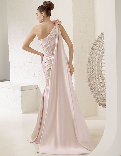 お色直しドレスです。立体的なお花のモチーフと、豪華なスカートラインの組み合わせが、胸元をカバーし、座った姿も、立ち姿も華やかに演出。
